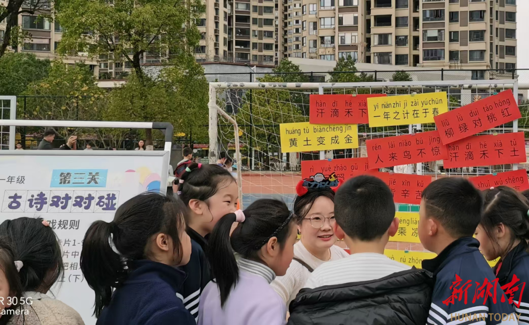 在郴州市华府小学的篮球场上,一场“趣味无‘纸’境”游考活动热闹举行。孩子们手持“闯关卡”,在12个融合了语文、数学、劳动、体育等学科的趣味关卡中穿梭,化身“识字小达人”“图形大侦探”,在玩乐中巩固知识,锻炼能力。