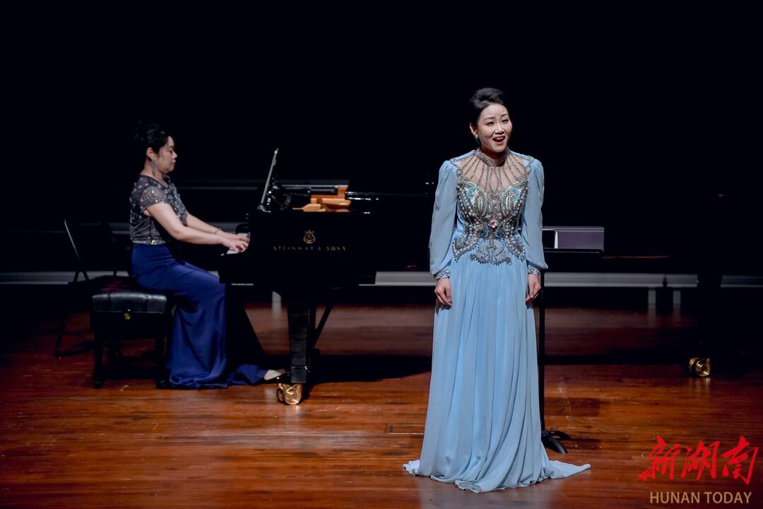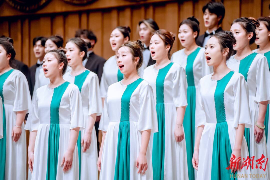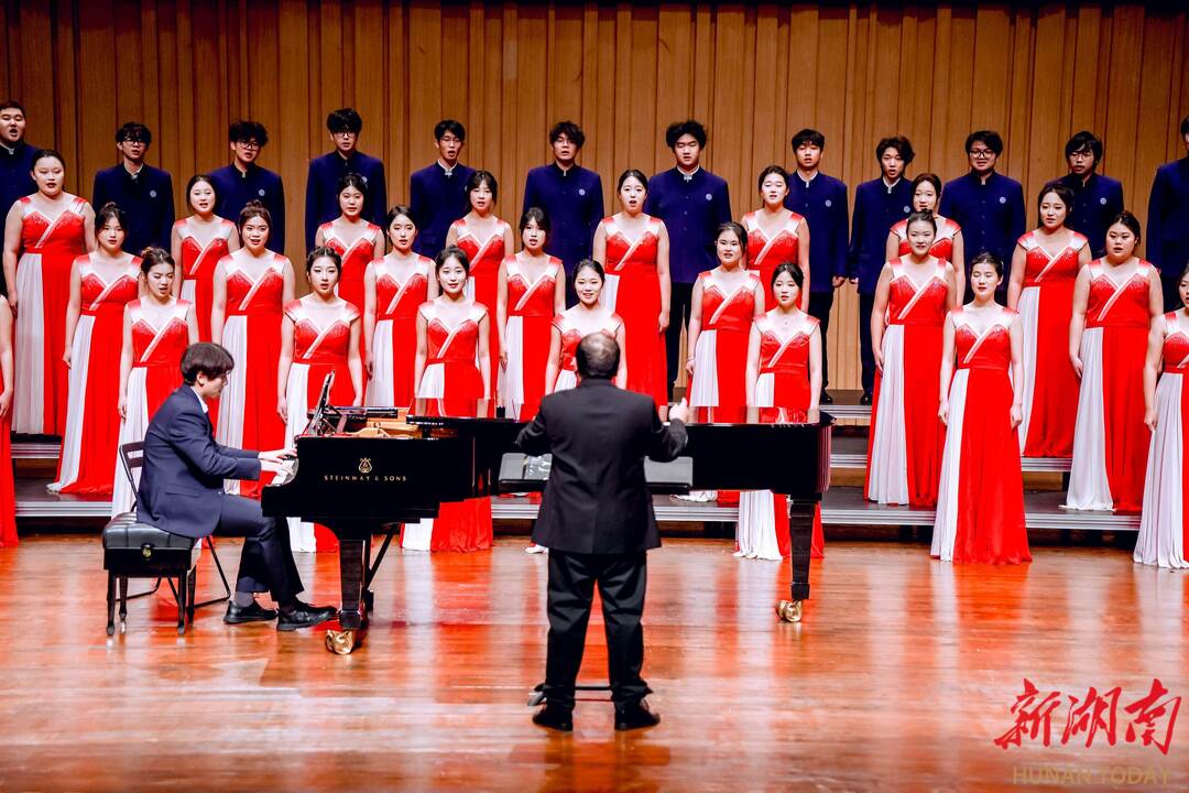 随后,演出内容转向富有湖湘地域特色的原创与改编作品。《家乡的脐橙》《臭豆腐香》《叮得儿响》等曲目,描绘本土风物与人情,生动亲切;《溜溜山歌》《绿鸟崽》《妹在深山打哟吙》等作品,则融合了湖南民歌元素与现代合唱手法,令人耳目一新。现场在混声合唱《勿忘国耻强中华》的激昂歌声中推向高潮,传递出强烈的家国情怀与时代精神。