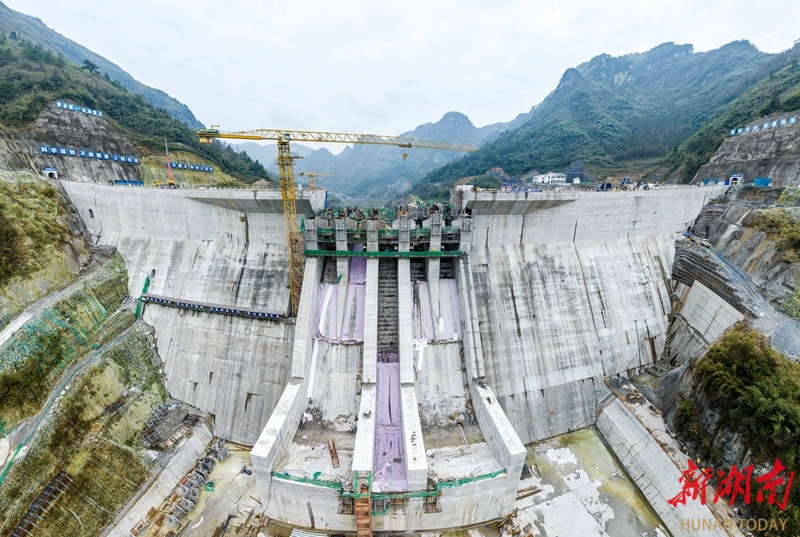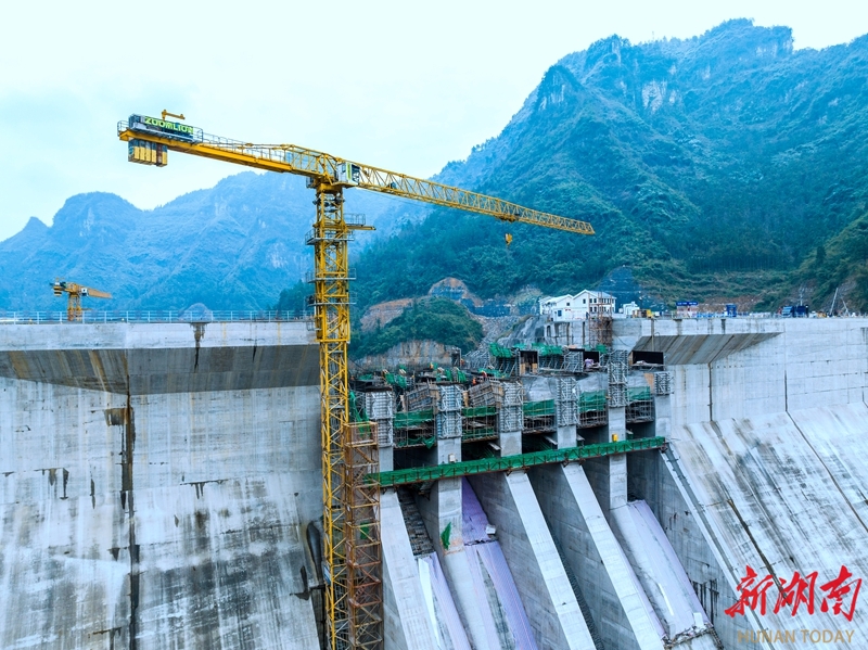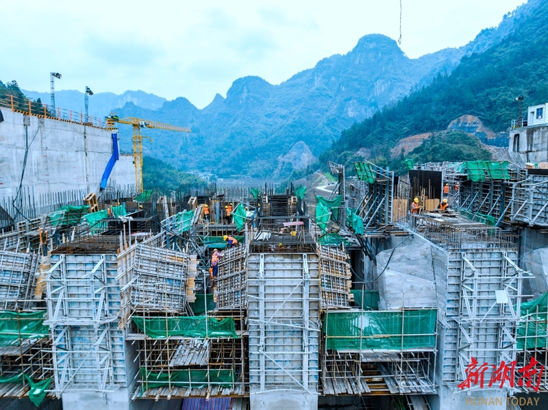 1月22日,吉首市矮寨镇大兴寨水库工程建设现场,工人在进行溢流坝段浇筑作业。面对近期低温雨雪冰冻天气,建设单位采取保温措施并优化施工安排,确保工程按计划推进。预计3月底可完成全部溢流坝段浇筑任务。彭璟 摄(湖南图片库)