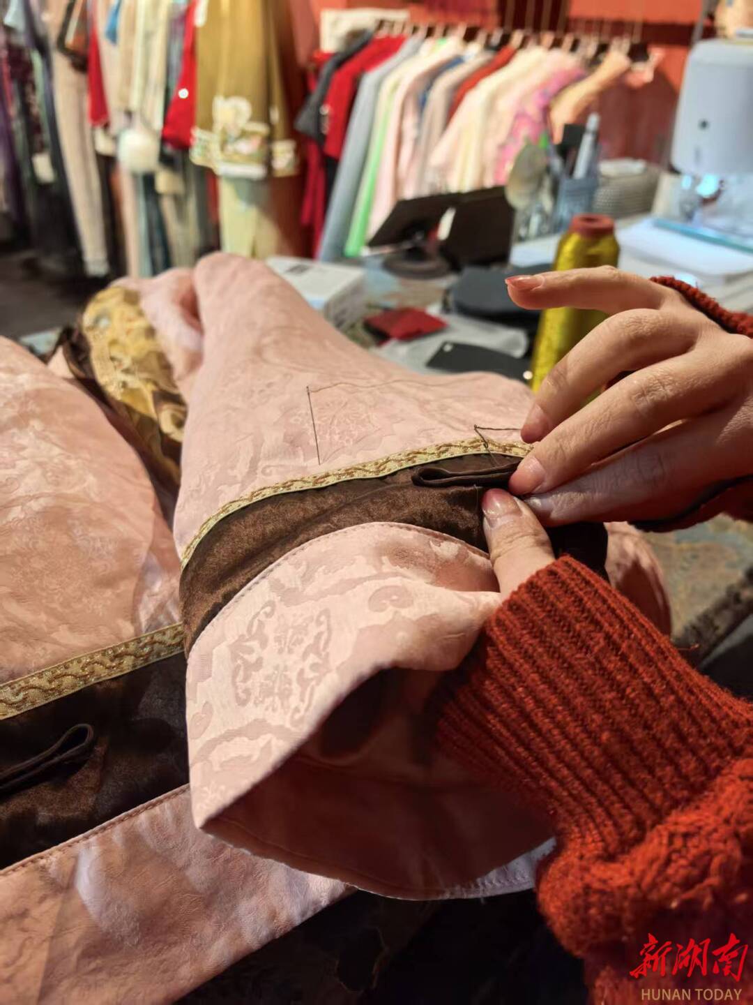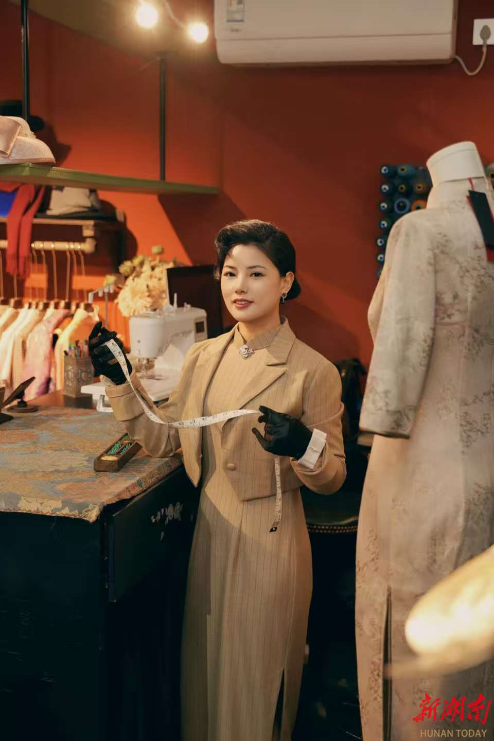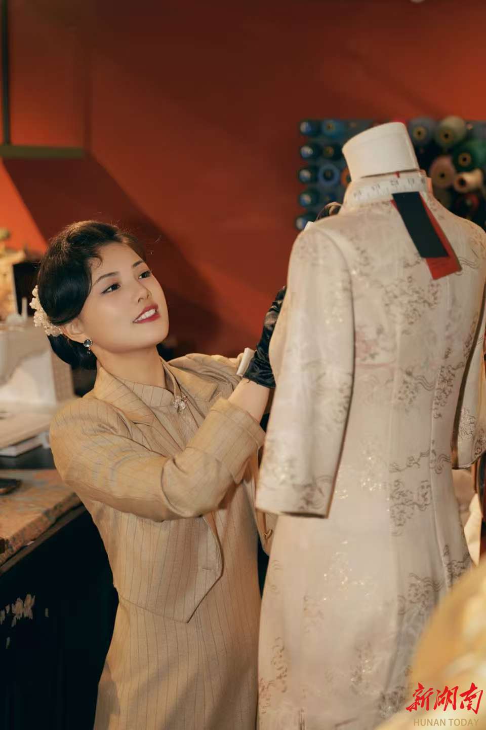 近日,长沙市芙蓉区定王台街道白果园巷,记者走进临街店面诗堤梵旗袍定制馆,仿佛穿越到民国时期的老上海。品牌主理人文雪洛端坐于工作台前,专注改制一件新中式婚服。