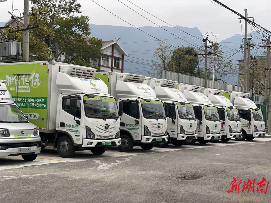 不远处,印有湖南供销“流动供销”统一标识的新能源冷链车整齐停放,车载终端实时回传着温度与轨迹。