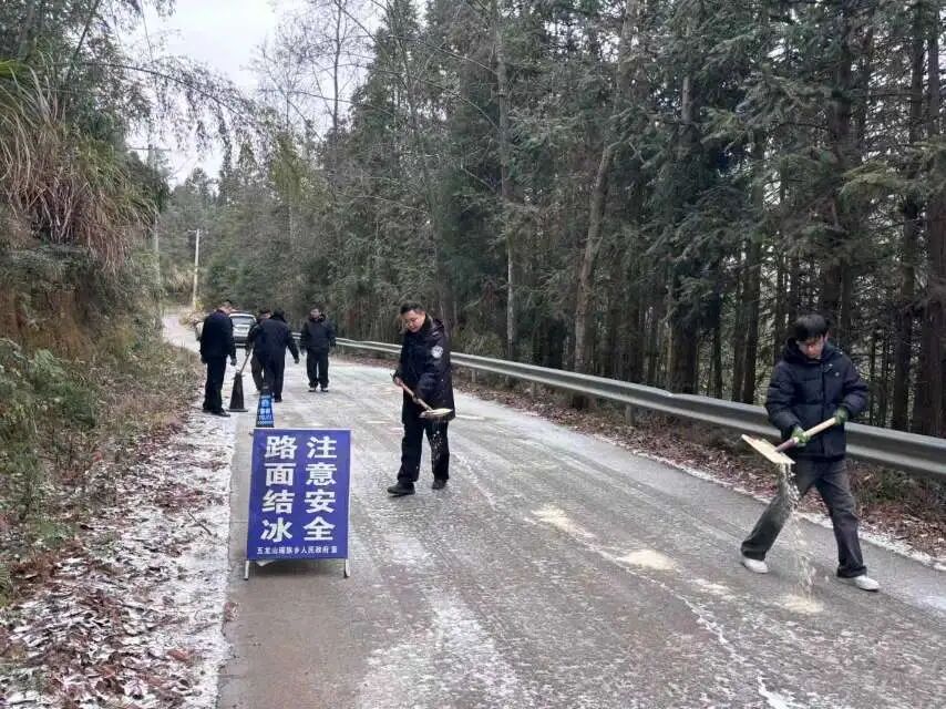 1月21日,宁远县五龙山瑶族乡政府联合派出所开展撒盐除雪行动。