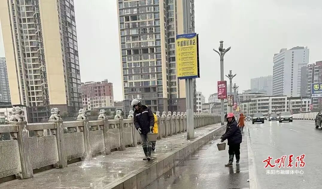 1月21日,耒阳市城管局组织人员开展桥面除冰保畅工作。