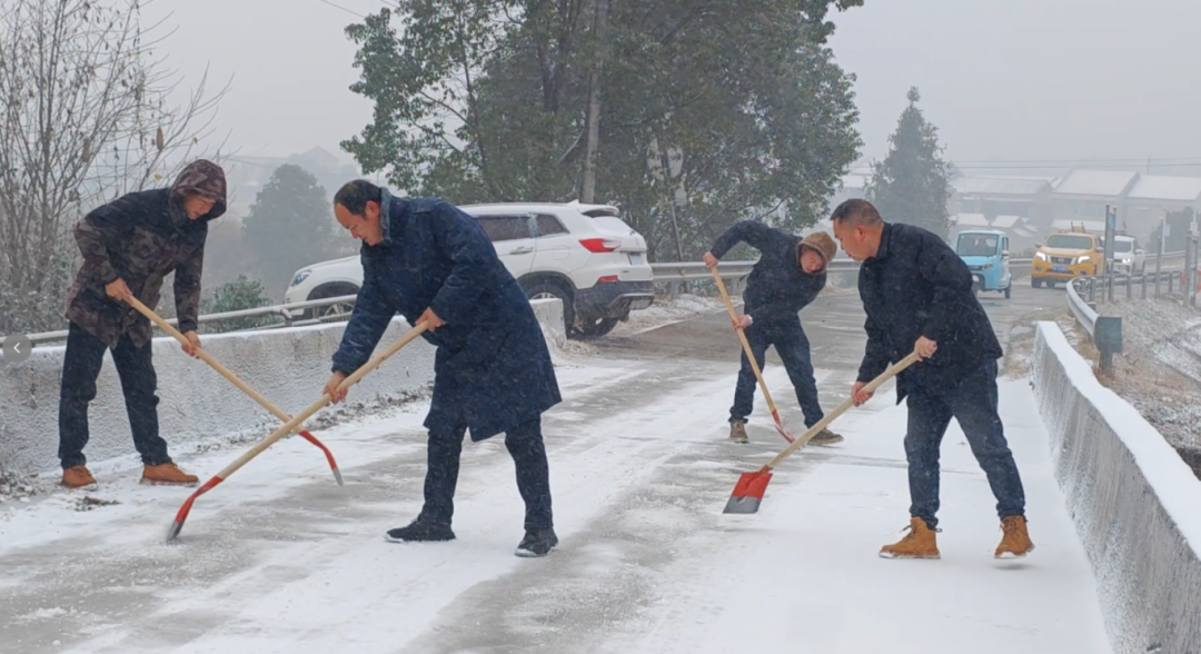 1月20日,汉寿县朱家铺镇工作人员在沧水桥等重点路段铲冰除雪,保障群众出行安全。