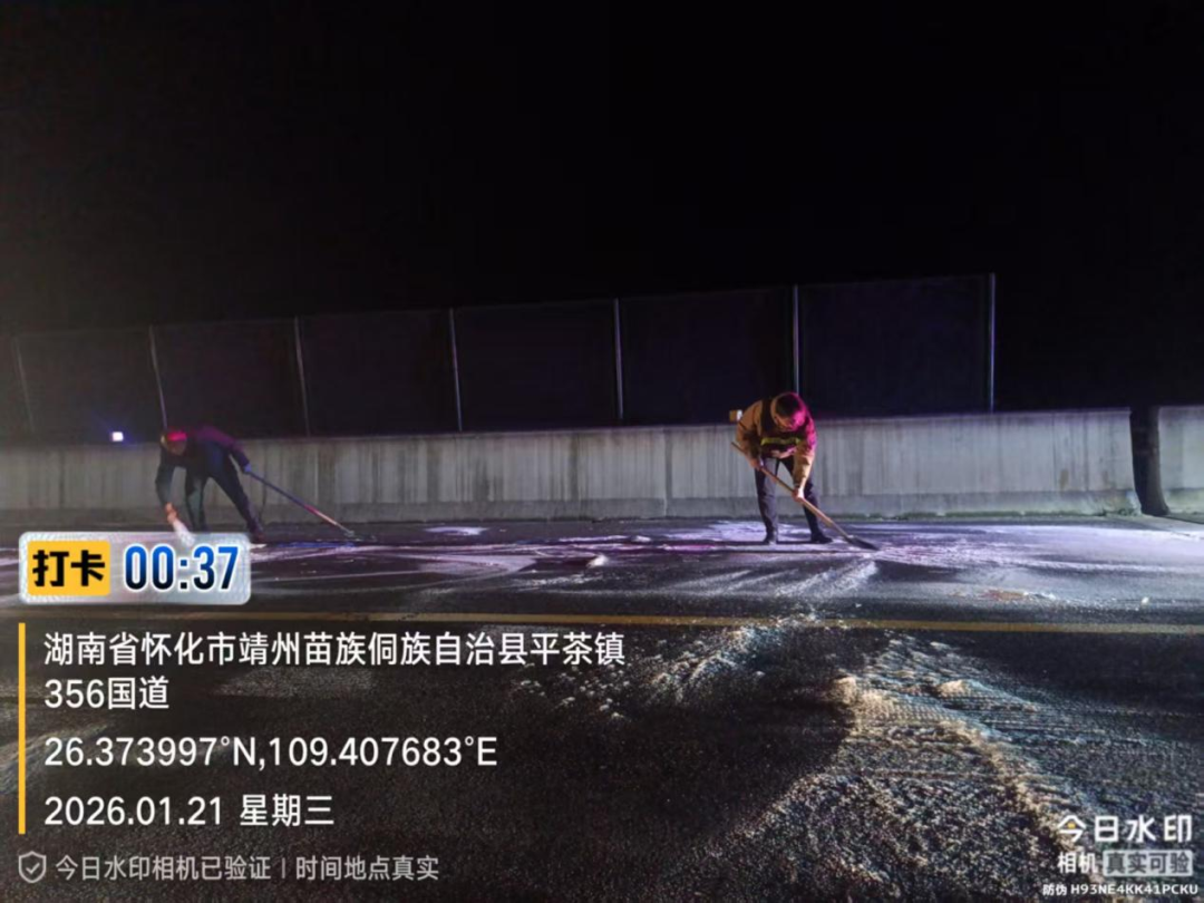 1月21日,靖州苗族侗族自治县平茶镇干部开展道路巡查,对结冰路段进行撒盐化冰处理。