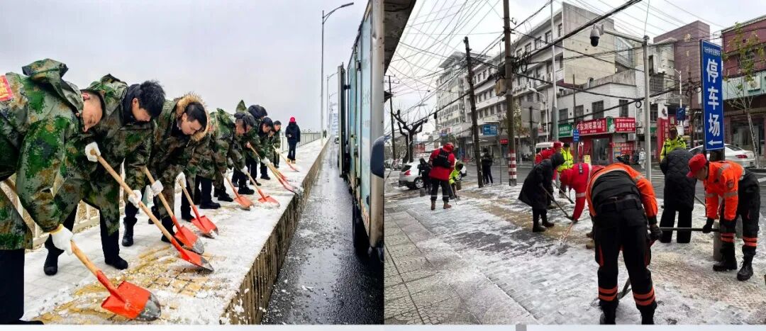 1月20日,华容县章华镇组织各村、社区志愿者,在主要道路、桥梁、陡坡及公共场所,开展铲雪除冰作业。
