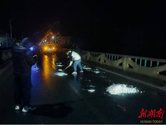 1月20日晚,新化县文田镇对S544、S242省道文田段结冰路段开展破冰行动,确保路面安全及公路畅通。