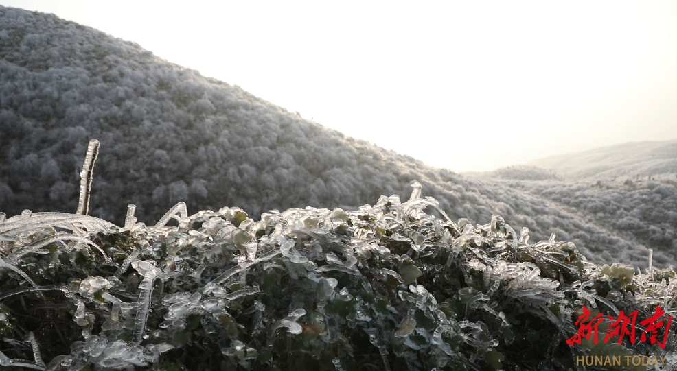 湖南日报·新湖南客户端1月23日讯(通讯员 黄春华)连日来,受冷空气影响,位于江华沱江镇的西边大岭海拔八百米以上区域迎来雾凇景观。雾凇,俗称树挂,是低温时空气中水汽直接凝华在物体上的乳白色冰晶沉积物。在西边大岭,这一自然杰作将连绵的山峦装点得如梦似幻。放眼望去,森林、草丛皆披上洁白莹透的“冰衣”,玉树琼枝,漫山遍野。矗立于山脊的巨型风车群,叶片上也挂满了冰凌,在云雾中若隐若现。山岭之上,晶莹的冰晶包裹万物,呈现出一派静谧的南国冰雪画卷。