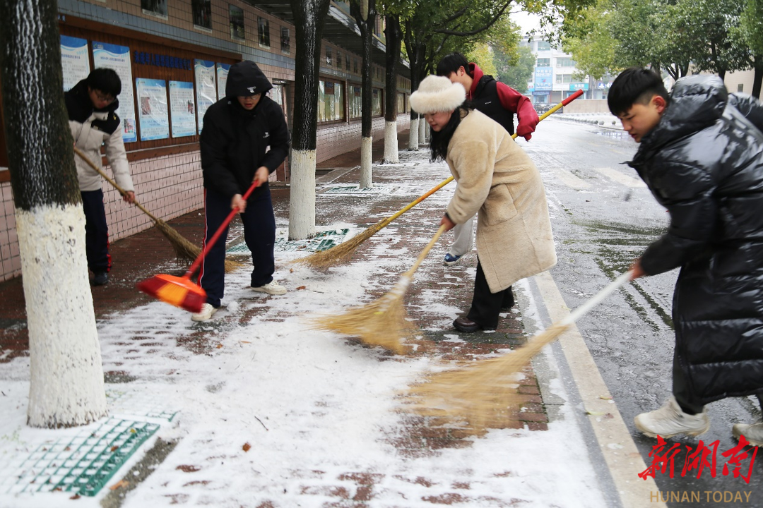 新湖南客户端1月23日讯(通讯员 宋涛)1月22日,2026年的第一场雪悄然飘落益阳万源人文高级中学,校园银装素裹,静谧如画。学生们兴奋地感受雪中校园的独特的韵味,并在老师的带领下,积极参与扫雪劳动,共同维护校园安全与整洁。