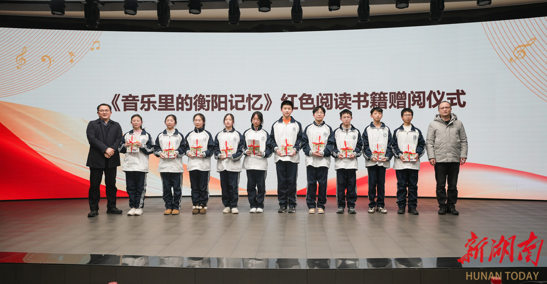在图书捐赠环节,湖南人民出版社党委书记、社长张勤繁和新华书店衡阳分公司总经理刘四海向学生代表赠予《音乐里的衡阳记忆(学生版)》丛书。据了解,丛书由湖南人民出版社出版,是一套专为少年儿童打造的党史学习教育读物,精选具有衡阳特色的红色经典曲目、模范人物与红色故事,以生动的笔墨、鲜活的画面呈现红色历史,引领少年儿童以音乐回望党史、以阅读铭刻初心,在潜移默化中厚植爱党爱国爱家乡爱人民的深厚情怀,为青少年党史学习教育提供了优质地方读物。