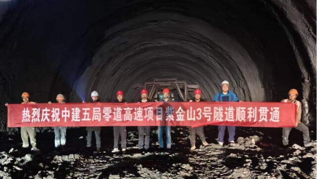 零道高速由中建五局参与投资建设,紫金山3号隧道是其核心控制性工程。该隧道为分离式特长隧道,全长3961米,穿越区域围岩地质条件复杂,地处山谷峭壁地带,且洞口紧邻国道。为破解建设难题,项目团队创新采用“正交横通道进洞+双向掘进”施工工艺,实现了复杂地形下的高效施工。在右洞贯通施工中,项目团队沿用左洞建设的成功经验,建立“超前地质预报+精准测量监测”双重保障体系,全程把控施工安全与工程质量,确保隧道贯通过程安全可控、精准高效。