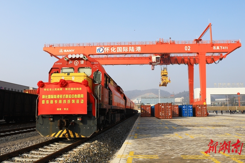 1月23日上午,一列满载货物的班列从怀化国际陆港多式联运中心铁路专用线平稳驶出,标志着怀化国际陆港多式联运中心启用,其铁路专用线班列实现首发。柴均林 彭雪杨 摄影报道(湖南图片库)