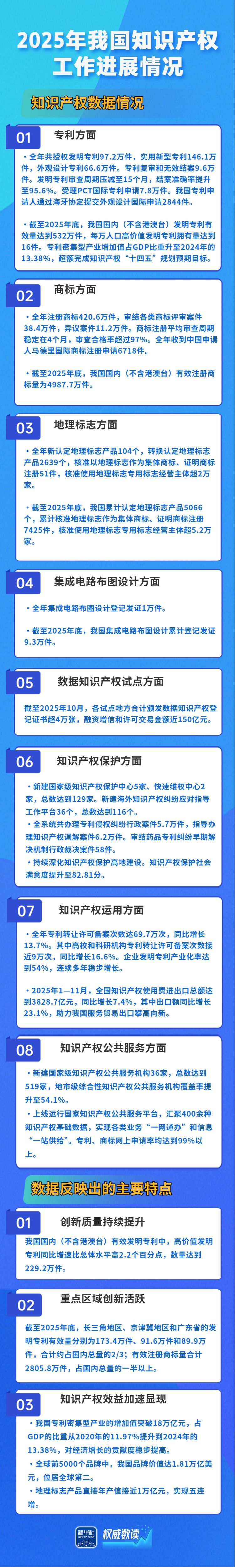 发明专利有效量达532万件,人工智能专利有效量居全球前列,地理标志产品直接年产值实现五连增……在23日国新办新闻发布会上,国家知识产权局介绍2025年我国知识产权工作进展情况。跟随海报,一起来看看吧。