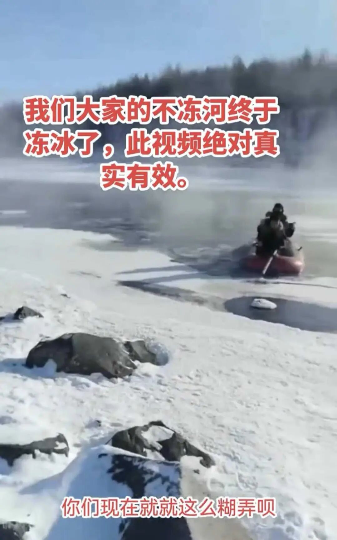 “绝对真实啊,我们的不冻河被毁了,你看这不冻河结冰了,看见了吗,还在这儿呢。”其中一名当地向导发视频说,画面显示河道中间有石头垒起的小坝。