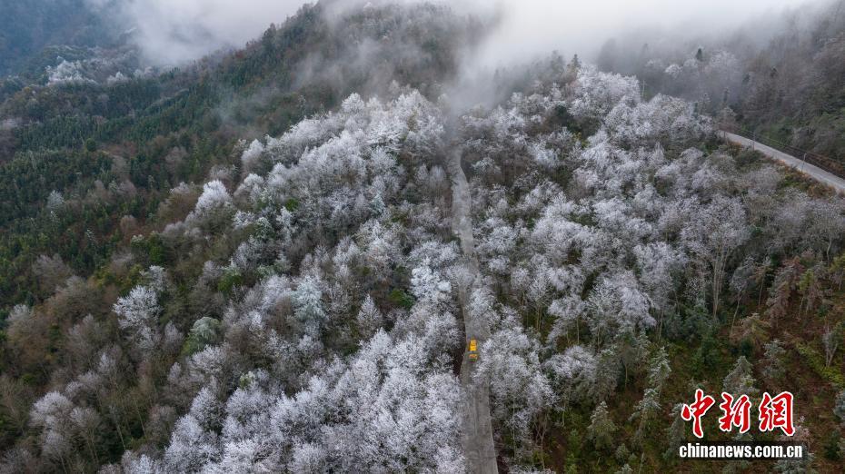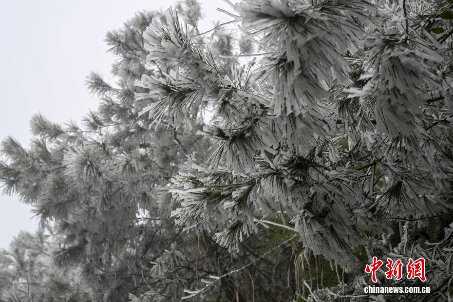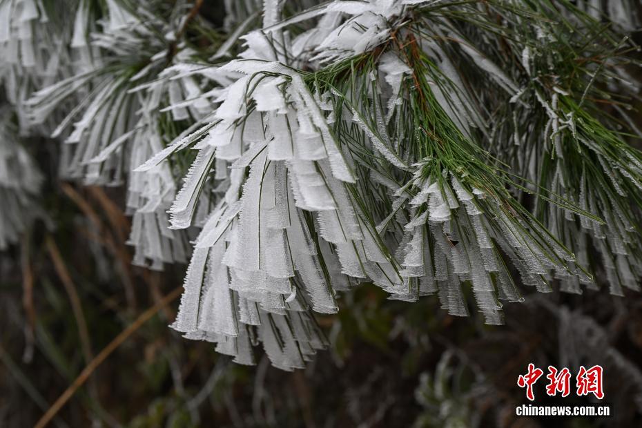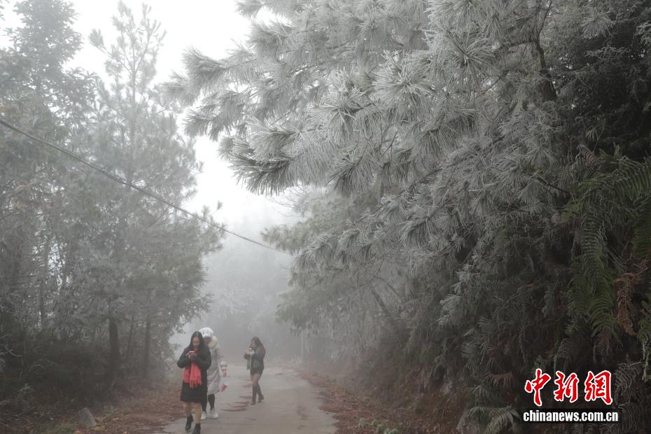 近日,受强冷空气影响,广西百色市田林县高海拔山区迎来雾凇景观。树木银装素裹,冰晶在枝叶间凝结成剔透的霜花,与远处云雾缭绕的山峦、山脚下绿意盎然的田园相映成趣,吸引游客前来观赏。图为田林县浪平镇雾凇景观。黄园艺 摄