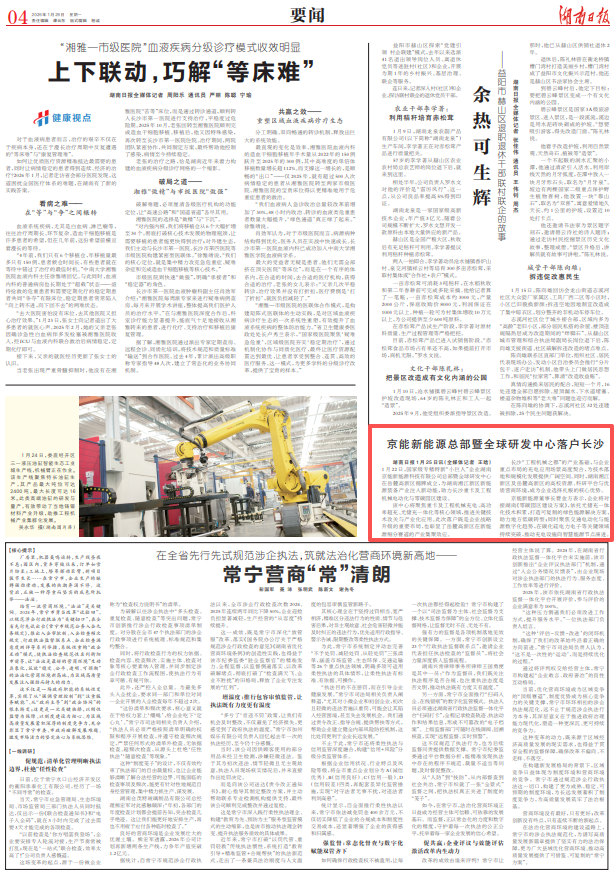 湖南日报1月25日讯(全媒体记者 王晗)1月22日,国家级专精特新“小巨人”企业湖南京能新能源科技有限公司总部暨全球研发中心在岳麓高新区揭牌成立,为湖南湘江新区新能源装备产业注入新动能,助力长沙重卡及工程机械电动化与零碳园区建设。