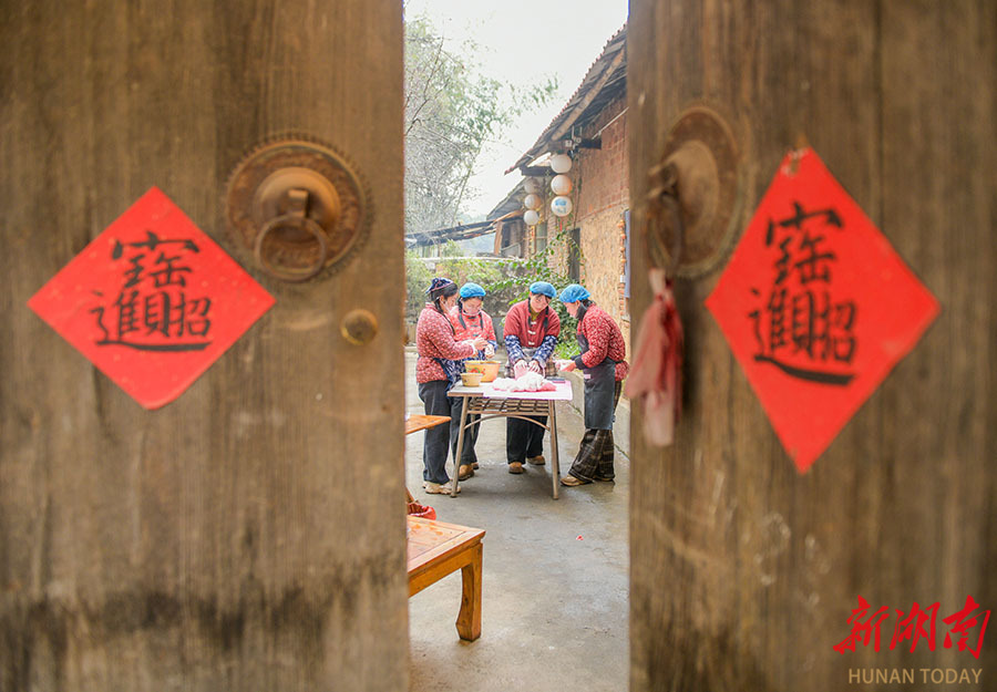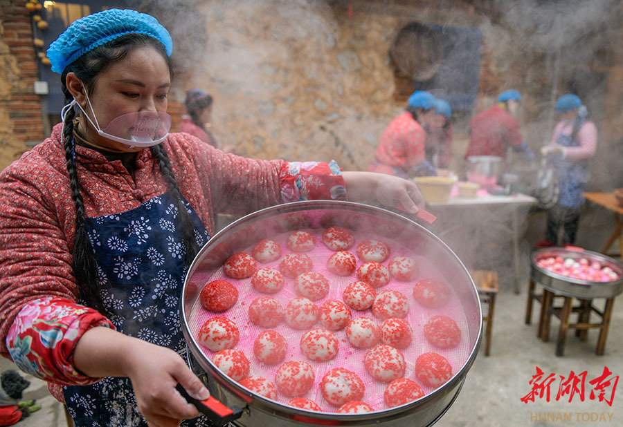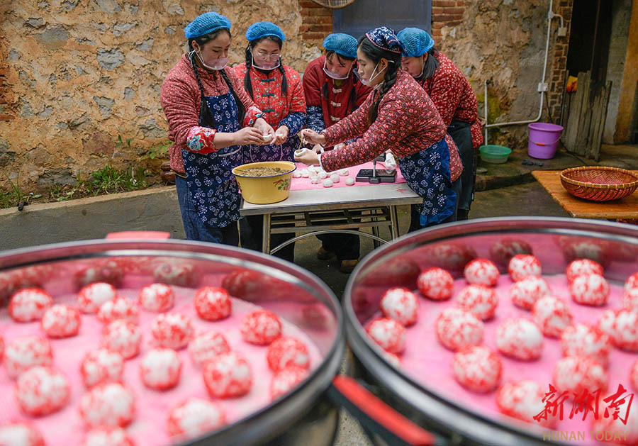 1月26日,宁远县舜陵街道和谐社区,居民正在赶制传统年节食品——红粑。春节临近,该县进入传统过年食品制作旺季。这种以糯米为主料、经多道工序制成的红色糕点,不仅是当地春节必备美食,更寄托着人们对团圆美满的美好期盼。 蒋克青 摄(湖南图片库)