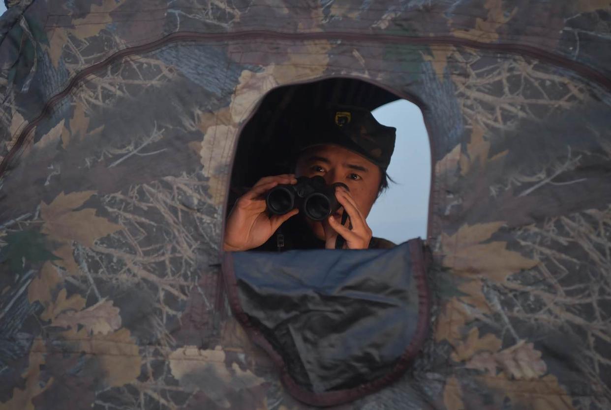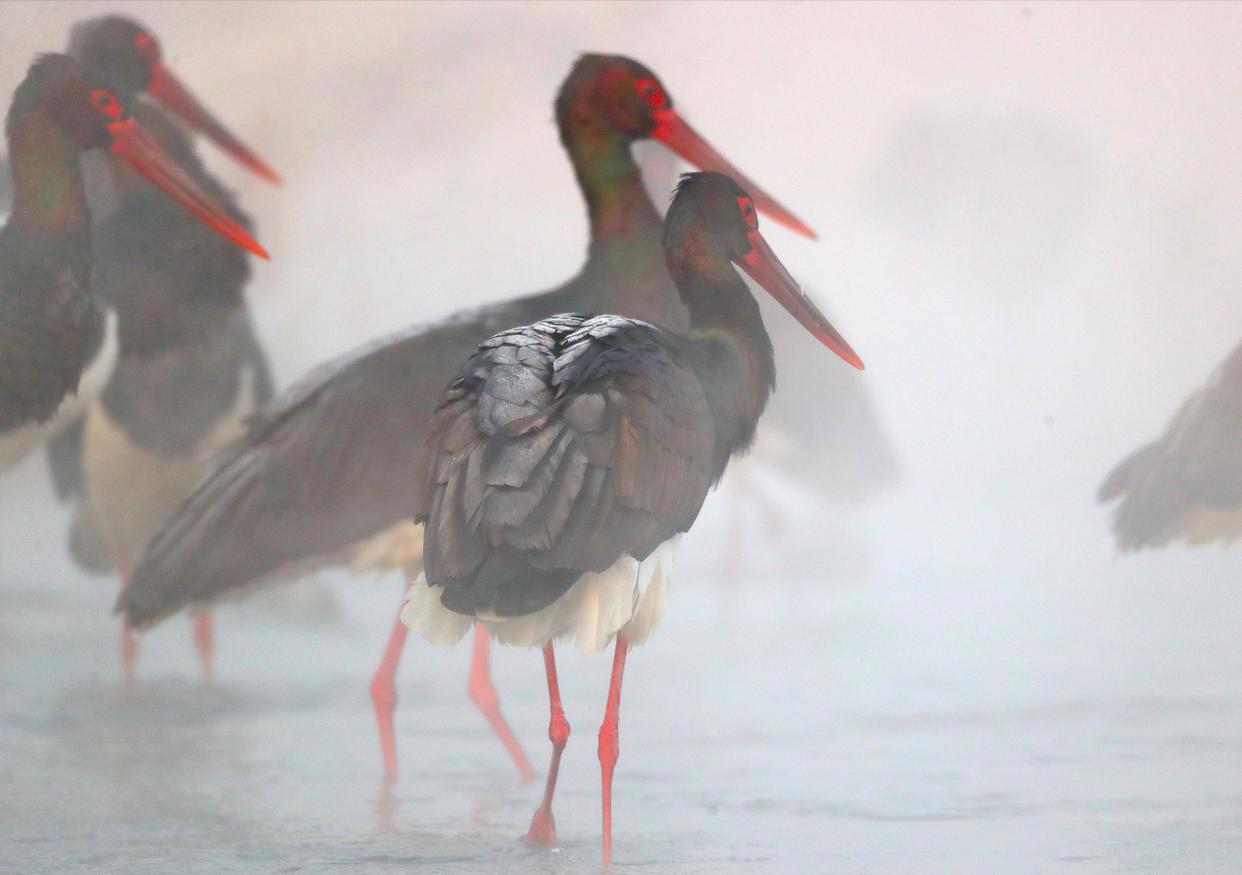 眼下,总共有26只黑鹳在拒马河畔流连,要拍摄到它们并不容易。太阳还没跃出地平线,巡护队员就要藏到掩体中,呼出的气让三脚架和云台上结了冰。天色刚刚亮起来,睡醒的黑鹳就来到河边,不停地梳理羽毛,薄雾笼罩着河流,宛如仙境。