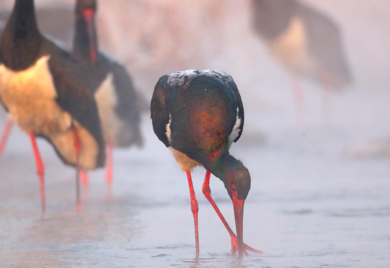 照片中,两只黑鹳脖颈儿交错,绒毛炸开。“它俩感情不错,这就算是差不多成了。当然,还得再相处些日子。”李理说,如果一切顺利,它们会在3月开始营巢,4月下蛋。仅仅1月26日一天,拒马河边的黑鹳就“成”了两对。