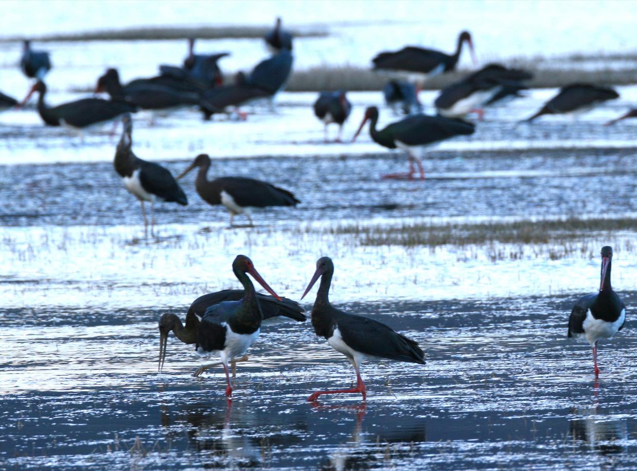 京城的黑鹳约有100只,其中七成安家拒马河。12月底直到来年的2月,黑鹳都会在拒马河流域聚集。河流的阴面已经冰封,阳面仍然露出水面,野生黑鹳在自由栖息、觅食,它们互相打量,有的还能渐渐通过交流变得情投意合。