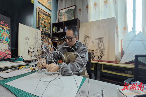 谌鲲鹏在制作“故事灯”框架