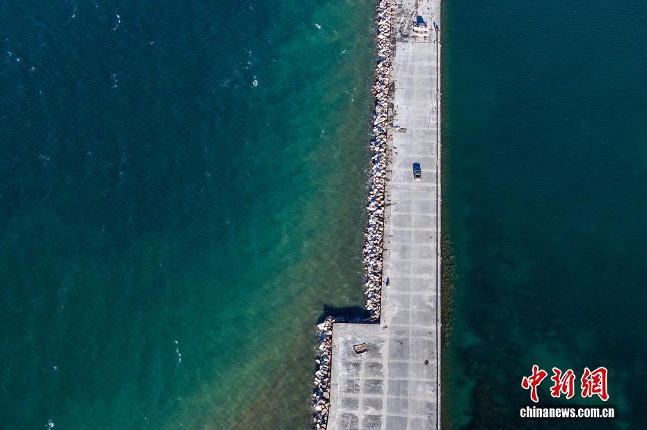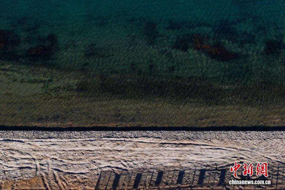 近日,青海省海南州,冬日的青海湖二郎剑景区在高原阳光的照射下清澈湛蓝,万物回归静谧之美。图为青海湖一隅。(无人机照片)薛蒂 摄