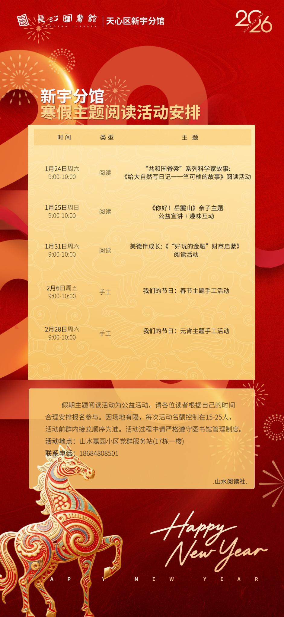 目前,各项活动正在新宇分馆如火如荼地进行中。这个寒假,欢迎大家走进长沙市图书馆新宇分馆,加入“山水阅读社”的精彩行列,让孩子们在阅读与活动中收获知识、快乐成长,开启一段充实而有意义的假期之旅!