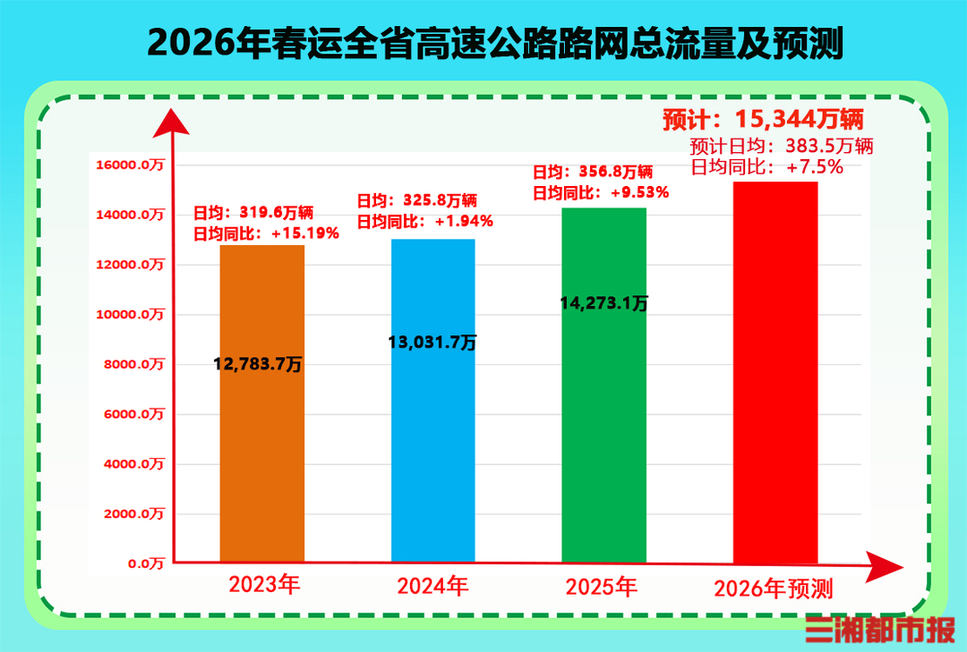 三湘都市报·新湖南客户端1月27日讯(全媒体记者 李致远)2026年春运即将于2月2日开始,3月13日结束,共计40天。记者今日从湖南高速集团获悉,根据研判,预计春运期间,全省路网车流总量将再创历史新高。而随着金醴扩容、醴娄(王仙枢纽至石三门枢纽段)、桑龙、炉慈、城龙(湘桂界)、张官(高坪互通至终点段)、新化至新宁等7条高速公路(项目)的通车,规划的31个高速公路省际通道全部打通。