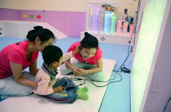 湘雅博爱康复医院为儿童开展多媒体感官情景训练。