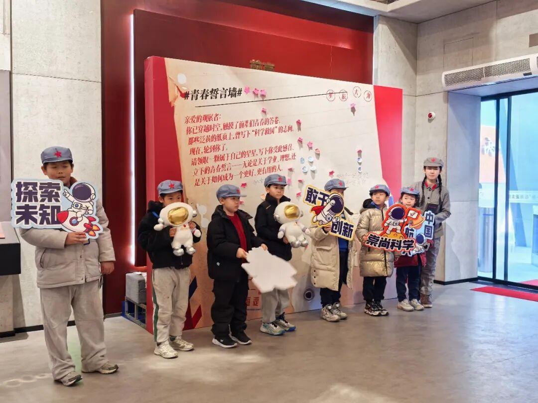 展区入口的“我的青春誓言”星空墙前,孩子们踮着脚尖,拿起星形便签写下心愿,“要当科学家”“努力报效祖国”……一张张便签贴满墙面,汇成一片璀璨星海,完成了一场跨越时空的精神接力。
