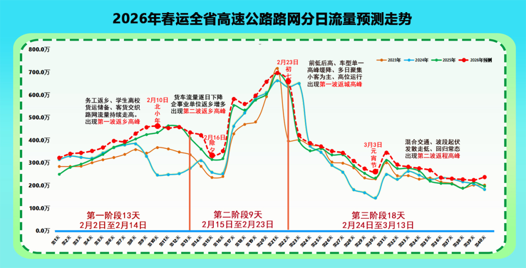 预计此阶段全省高速公路路网流量达5,306.6万辆,占春运总流量的34.6%。春运返程第二波车流高峰,预测出现在3月4日(正月十六),峰值流量为343万辆,此后,整体流量较春节阶段将大幅下降并日渐趋缓,路网运行逐步恢复常态。