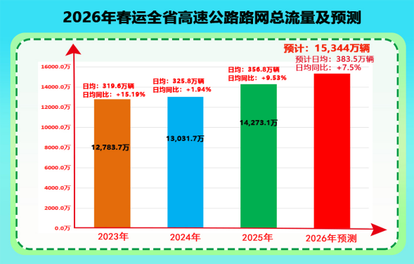 预计2026年春运全省高速公路出入口总流量为15,344万辆,较2025年春运同比增长7.5%,日均流量383.5万辆,为平日流量的1.6倍(2025年日均流量为241万辆)。省内中短途自驾车辆占比高,出行时段较为集中,多种车流叠加,客流呈阶段性变化,路网车流量保持高位运行。
