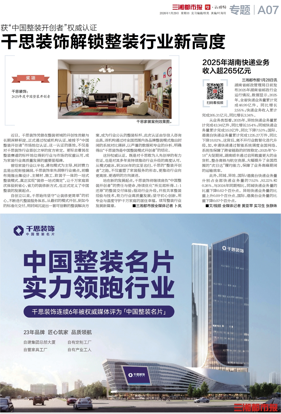 站在新的发展起点,千思装饰将继续肩负“中国整装开创者”的责任与使命,持续优化“所见即所得、1:1还原”的整装交付体验;驱动行业升级,开放共享整装经验与技术,助力行业高质量发展;坚守初心创新,用专业与温度守护千万家庭的居住幸福,续写整装行业发展新篇章。■三湘都市报全媒体记者 卜岚