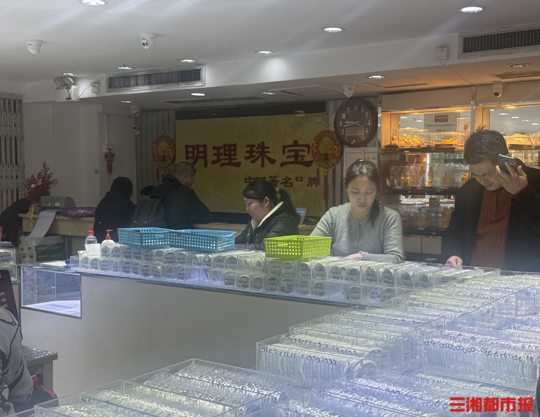 1月28日中午,记者来到明理银饰长沙名汇达黄金珠宝交易中心店,发现店内人头攒动,货架上的银饰被翻拣得凌乱,多位工作人员正同时接待批发客户,无暇顾及散客。“现在批发生意太忙了,板料严重缺货,根本订不到,价格也没法固定,建议需要买入的去别家问问。”工作人员一边整理订单一边说。一位来自义乌的银饰批发商告诉记者,她这次专程来长沙“反向进货”:“长沙市场的款式更多,虽然成本涨了一倍,但是如果现在不多进点货备着,万一银价继续猛涨,成本可不好控制咯。”