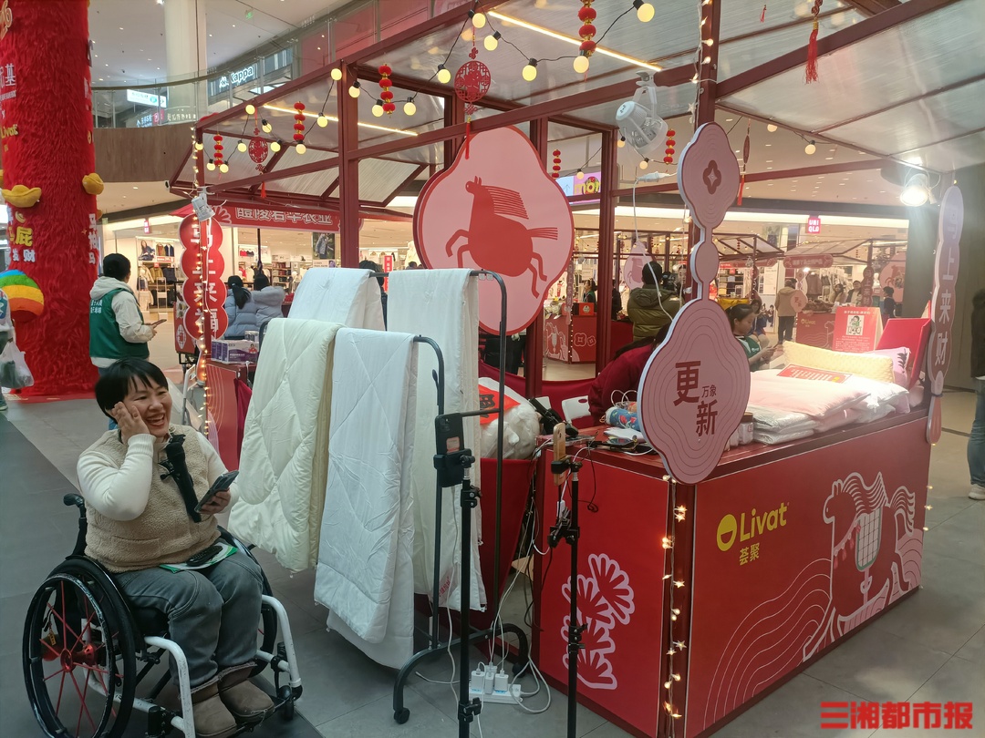 三湘都市报·新湖南客户端1月29日讯(文/视频 全媒体记者 杨昱)“各位网友好,我是‘肚子缝纫姐’唐漫霞,今天是我在商场销售蚕丝被的第一天,希望能有个好开头。”1月28日,长沙荟聚一楼展销区内,“爱心摊位”整齐排列,展示着来自全省各地残友创业的百余款产品,一场温暖而特别的助残年货集市拉开帷幕。