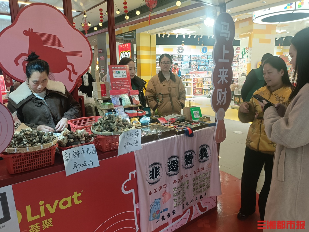 1月28日,在长沙荟聚,吴添春(右)带来了家乡的特产。(杨昱 摄)