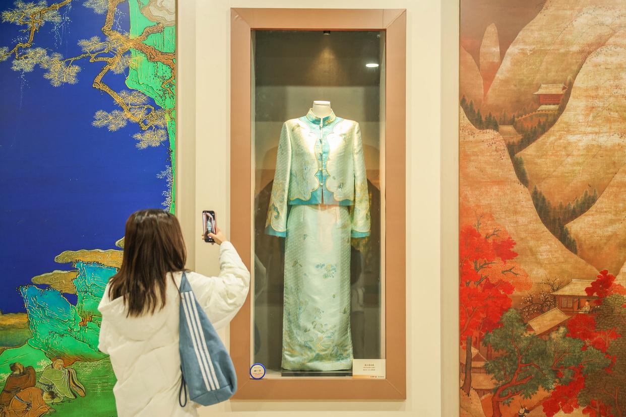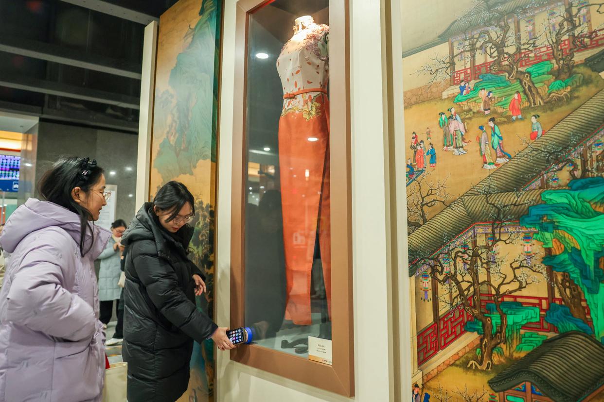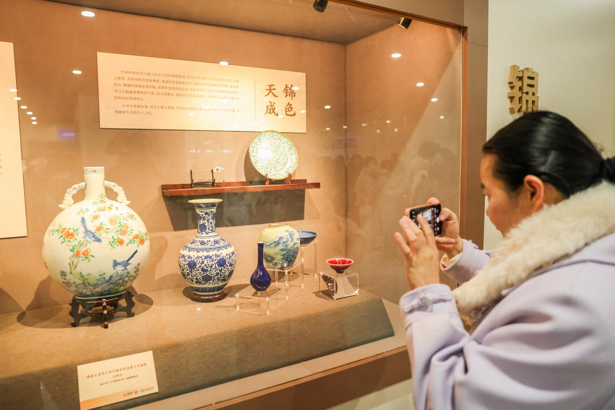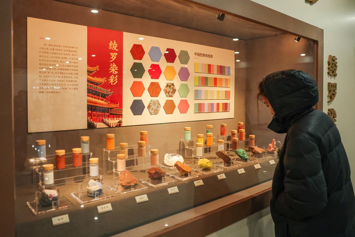 步入16号线国家图书馆站E口通道及站厅,一场色彩盛宴铺陈眼前。本次主题展览打造“渲染千年”“锦色天成”“绫罗染彩”“墨韵礼色”“赏色寻乐”五大展区,不仅陈列着配色精妙的瓷器、工艺细腻的宋锦等实物,还展出了多部记录色彩文化的典籍,让乘客在步履之间,感受东方美学的魅力。
