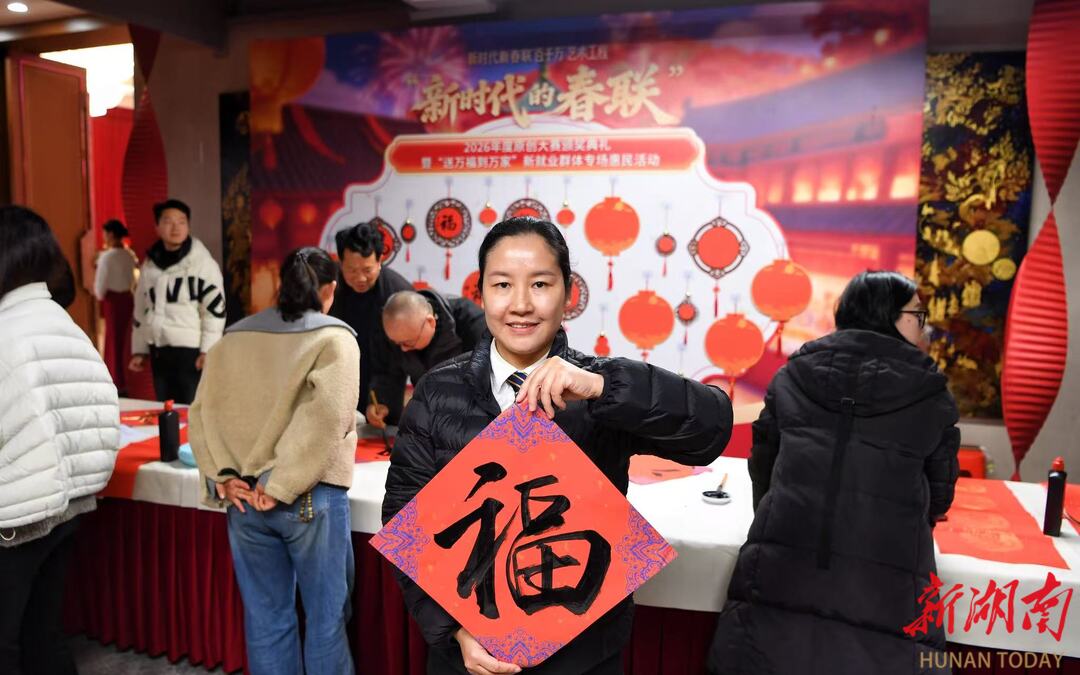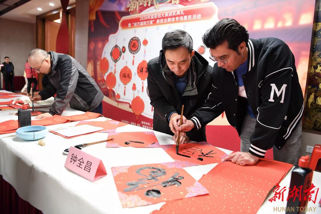 1月29日下午,湖南日报社新湖南大厦内张灯结彩、墨香四溢,“新时代的春联”2026年度原创大赛颁奖典礼暨“送万福到万家”新就业群体专场惠民活动在此热烈举行。领导嘉宾、书法家代表、新就业群体代表、获奖作者代表、外国友人与市民群众齐聚一堂,共同见证大赛成果,共赴一场年味浓郁、暖意融融的文化盛宴。
