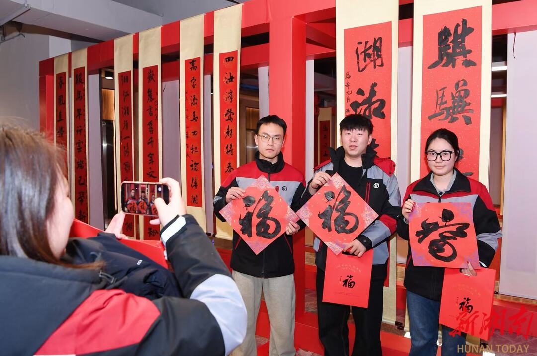 书法家们案桌相连,一字排开,构成一个热闹的“开放式创作现场”。中国书法家协会副主席、湖南省书法家协会主席鄢福初,省文联兼职副主席、省书协副主席兼秘书长胡紫桂,中国书法家协会理事、省书协副主席吴萍,中国书法家协会理事、省书协副主席崔向君,省书协名誉副主席王集,省书法家协会副主席王希俊,省书法家协会副主席袁绍明,省书法家协会主席团成员黄晖,省书法家协会副秘书长陈毅华,省青年书法家协会主席钟全昌,以及彭灿辉、陈兆亮、邓庭鲁、付力、梁松等省青年书法家协会的书法家,满怀热情,挥毫泼墨。笔锋流转间,大赛获奖佳作化作一副副墨香浓郁、祝福满满的春联和“福”字,赠送给现场市民和外国友人。长龙般的队伍、蒸腾的墨香、欣喜的笑脸,交织成腊月里温暖的风景。