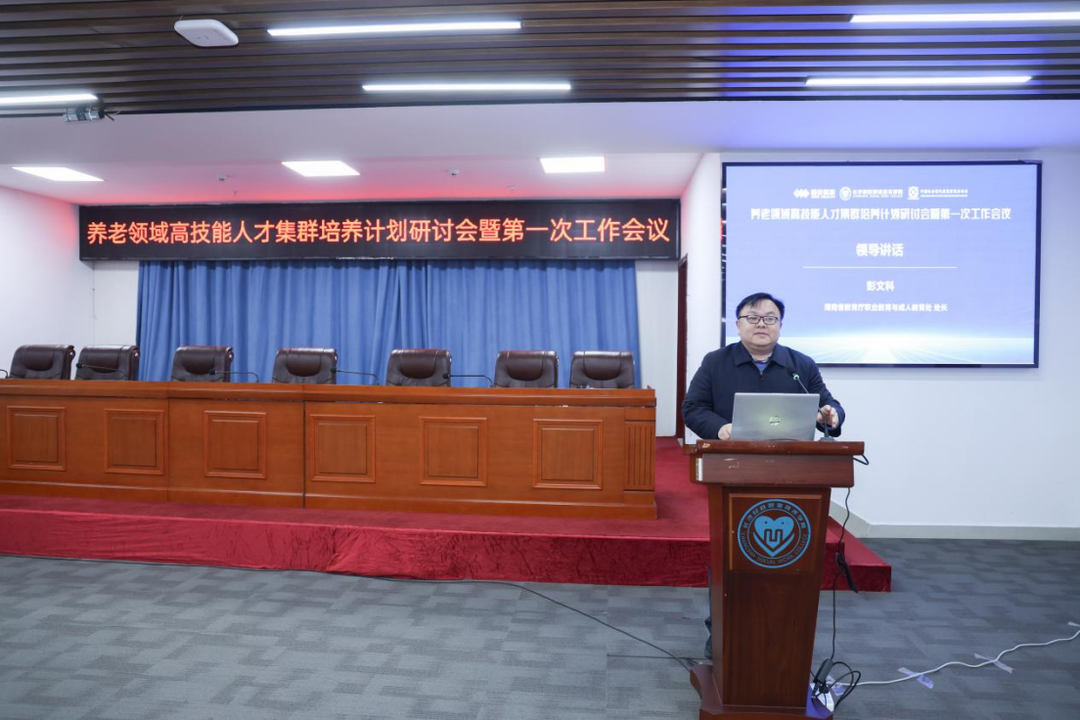 彭文科在讲话中肯定了长沙民政职业技术学院在养老人才培养方面的积累与探索。他表示,高技能人才集群培养必须构建“政、校、企、研、协”深度融合的育人生态,推动人才培养从传统模式向与产业需求“同频共振”的系统化支持体系升级,积极探索具有中国特色、时代特征的养老高技能人才培养的新范式。