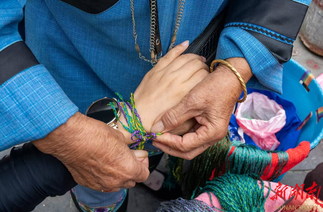 老艺人执刻刀雕琢木器,绣娘指尖翻飞制作苗绣,这些非遗技艺已成为增收的产业;老手与嫩手共编彩绳,传递的是技艺,更是温度。苗家妇女擦拭银饰,商贩手持杆秤,摊主怀抱着幼犬……小小集市里,特色种养、文创开发正拓宽着群众的增收之路。