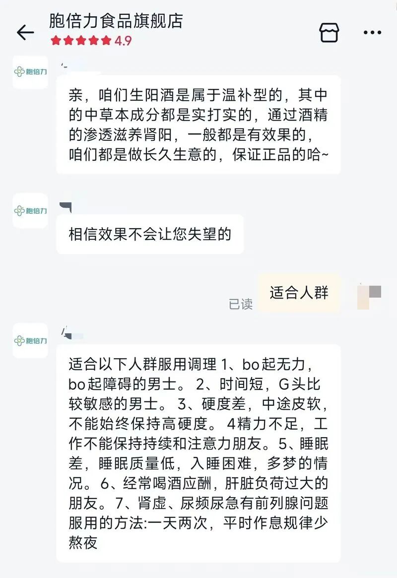 与此类自泡酒相比,商家在销售预包装类男性“养生酒”时普遍较为谨慎,但与男性功能相关的“擦边”宣传仍不少见,个别商家还会在买家咨询时进行功效暗示或宣称。