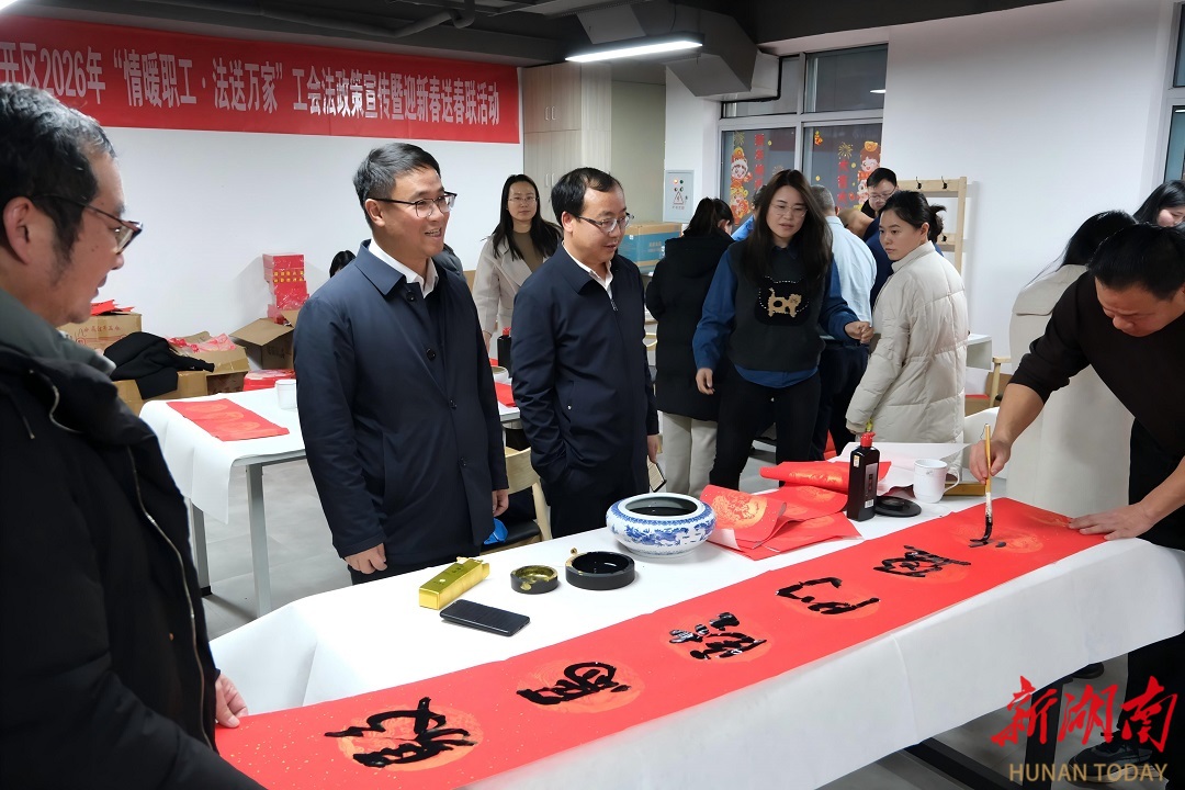 1月29日,宁乡经开区总工会在蓝月谷工人文化宫开展“情暖职工·法送万家”活动。现场设置法律咨询台,发放《工会法》宣传资料,并邀请书法家及爱好者为职工书写赠送春联、福字,营造了学法守法、喜迎新春的浓厚氛围。陈晛 摄