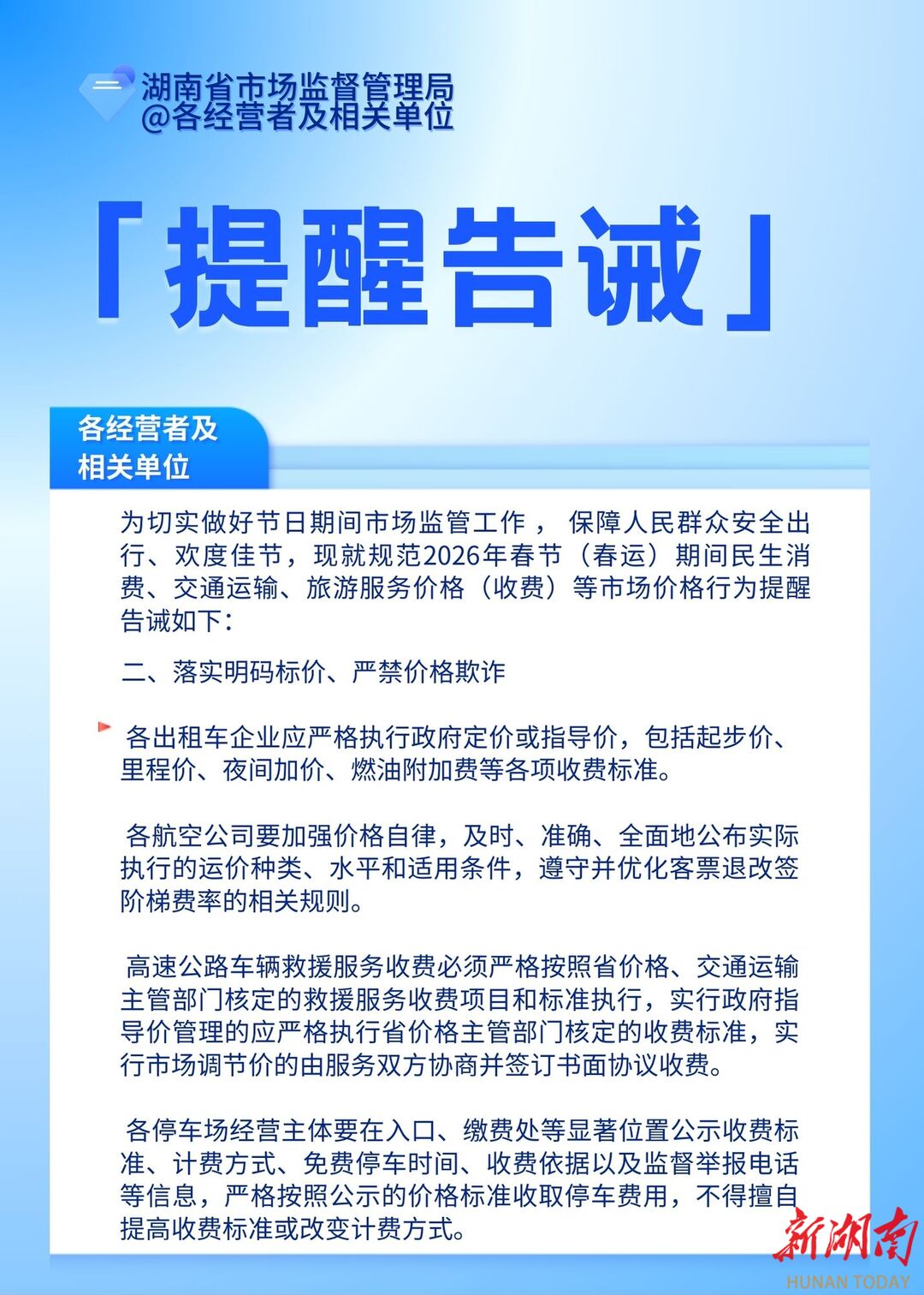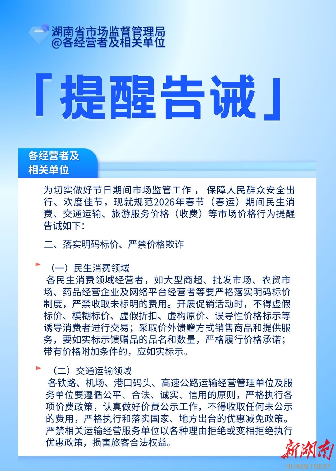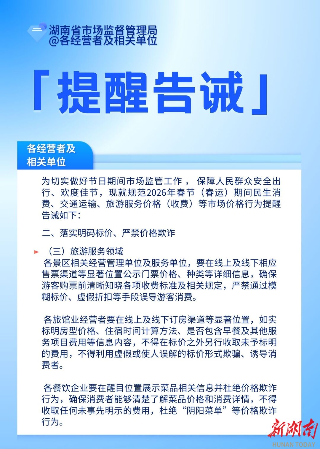 湖南日报1月29日讯(全媒体记者 李成辉)春节是民生消费、旅游出行的需求峰值期,也是消费投诉的易发高发期。1月29日,省市场监督管理局向全省各经营者及相关单位发布价格行为提醒告诫函,对相关领域的价格经营行为作出规范要求。