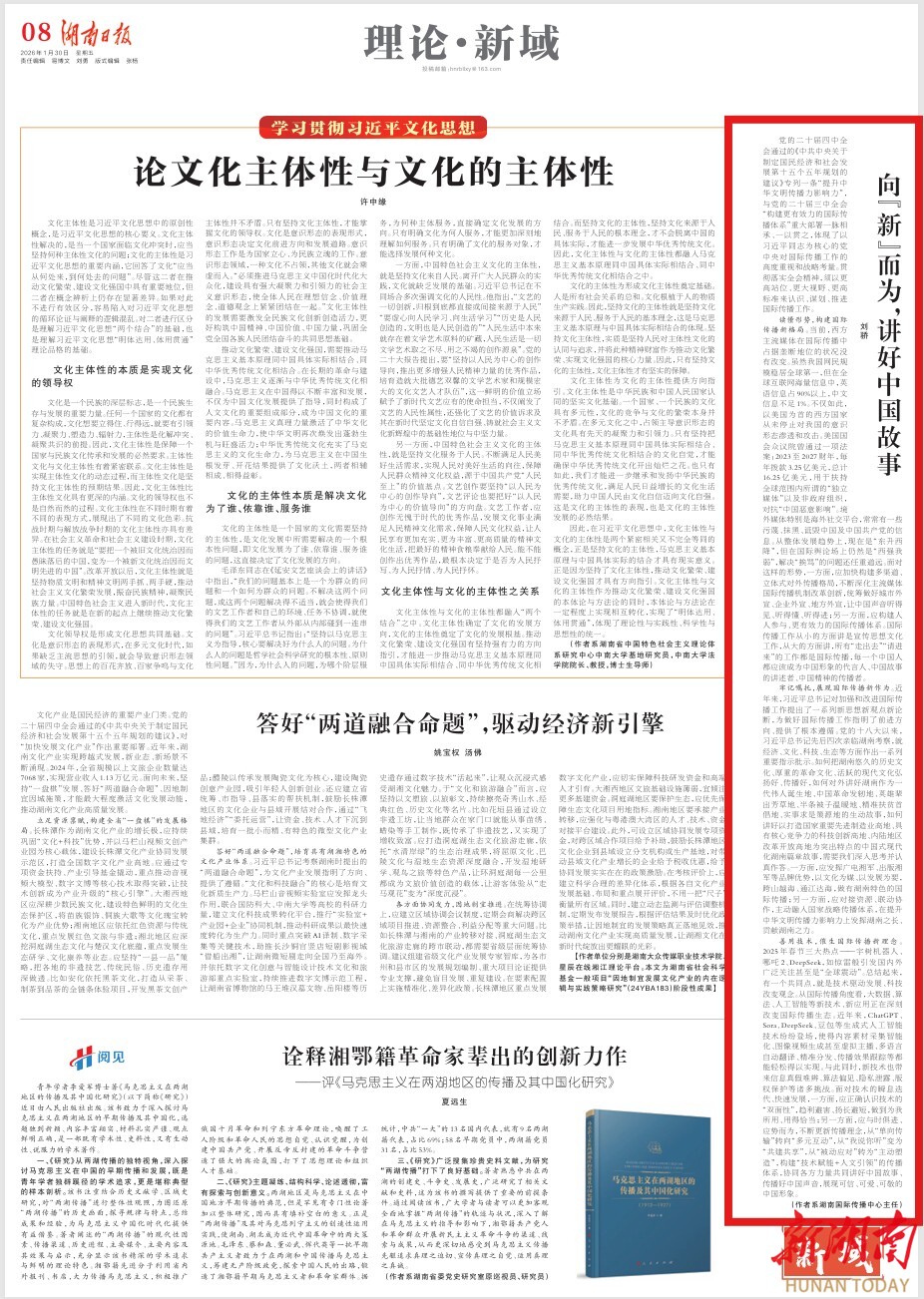 牢记嘱托,展现国际传播新作为。近年来,习近平总书记对加强和改进国际传播工作提出了一系列新思想新观点新论断,为做好国际传播工作指明了前进方向、提供了根本遵循。党的十八大以来,习近平总书记先后四次亲临湖南考察,就经济、文化、科技、生态等方面作出一系列重要指示批示。如何把湖南悠久的历史文化、厚重的革命文化、活跃的现代文化弘扬好、传播好,如何对外讲好湖南作为一代伟人诞生地、中国革命发轫地、英雄辈出芳草地、半条被子温暖地、精准扶贫首倡地、实事求是策源地的生动故事,如何讲好以打造国家重要先进制造业高地、具有核心竞争力的科技创新高地、内陆地区改革开放高地为突出特点的中国式现代化湖南篇章故事,需要我们深入思考并认真作答。一方面,应发挥广电湘军、出版湘军等品牌优势,以文化为媒、以发展为要,跨山越海、通江达海,做有湖南特色的国际传播;另一方面,应对接资源、联动协作,主动融入国家战略传播体系,在提升中华文明传播力影响力上发挥湖南之长、贡献湖南之力。