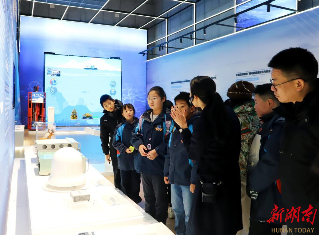 在专业讲解员的引导下,同学们兴致盎然地参观了智谷项目数字空间站内的国家自主创新示范区成果展。展览以“实物+科技+文化”相结合的方式,系统呈现了长株潭国家自主创新示范区在工程机械、轨道交通、航空航天与深海深地、先进计算、新材料新能源、生物医药大健康、未来产业等多个领域的重大科技创新成果。