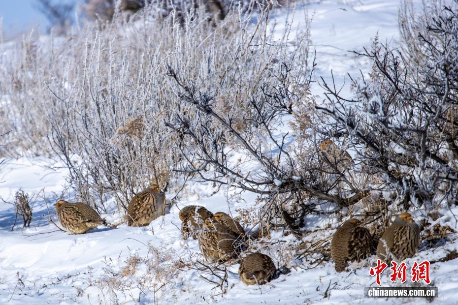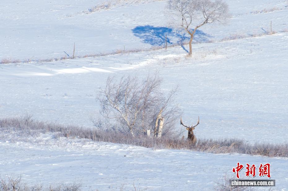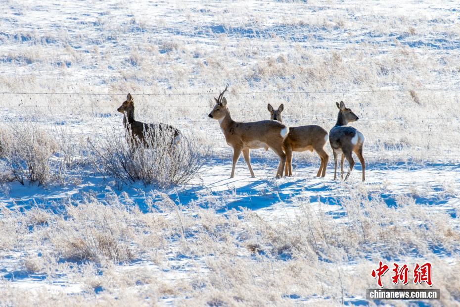 近日,内蒙古自治区锡林郭勒盟锡林浩特市白音锡勒草原出现雾凇景观。日出晨光洒落雪原,千树万枝凝霜挂雪,如玉树琼枝缀满苍原。牛群在雪地上悠闲踱步,马群沿山坡奔腾驰骋,马鹿踏雪撒欢,狍子驻足凝视,沙半鸡结伴觅食……生灵们的身影为静谧雪原注入鲜活生机。图为雪原上的狍子。崔巍光 摄