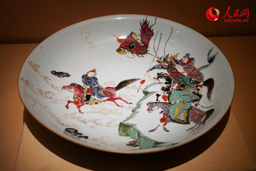 粉彩刘备过檀溪图盘。