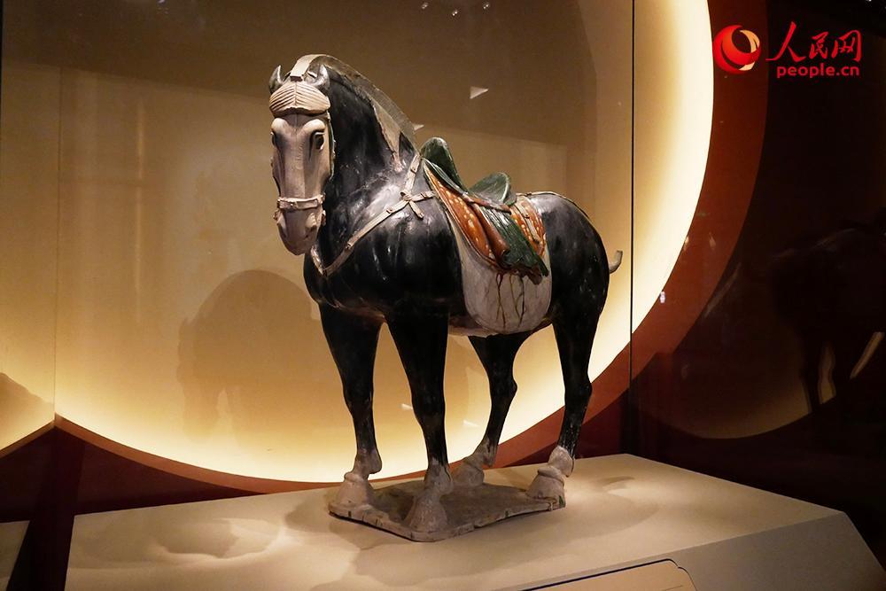 展品中,有一件唐代的三彩黑釉陶马吸引不少观众。唐马雕塑一改秦汉时期平稳古拙的风格,展现出高昂彪悍的生动姿态。这件唐马的珍贵之处还在于,除面、鬃、尾、蹄涂白釉外,全身披黑釉,在唐三彩中实属罕见。在展厅外,以此为核心元素的“一匹黑马”马年系列文创也同步上新。国博(北京)文化产业发展有限公司负责人廖飞介绍,一是“黑马”的寓意好,“希望丙午马年之际,每个人都能成为自己心中的那匹黑马”;二是从文物价值来讲,唐代三彩黑釉陶马目前已知存世仅两件,十分珍贵。
