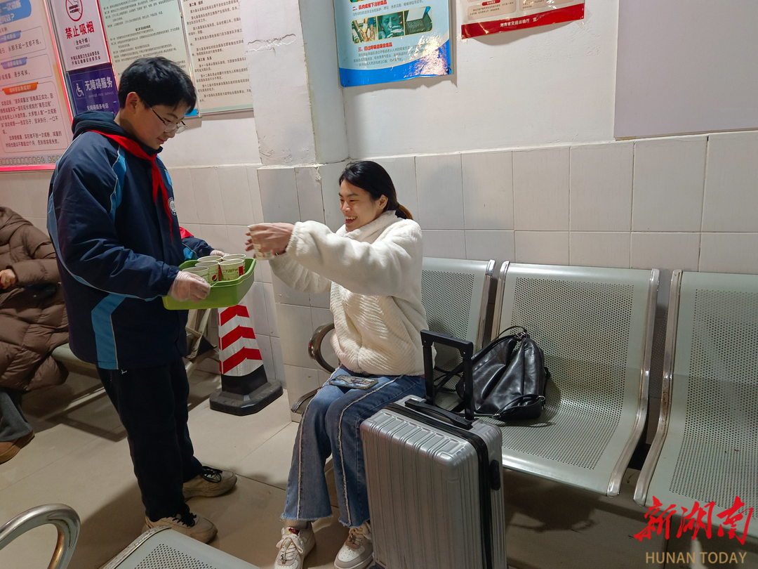 同时志愿者们还为奔波的旅客递上暖手宝与热水,一句“天冷了,您暖暖手”,让冰冷的雨天多了几分温情,旅客们纷纷为这群小志愿者点赞。